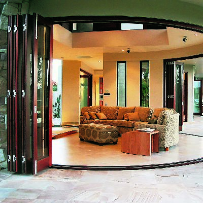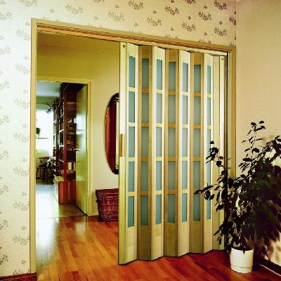 Les cloisons coulissantes de l'accordéon sont un mécanisme de pliage, qui est également attaché au système de rouleau, mais les panneaux sont pliés d'une manière différente. Si dans le mécanisme du type de compartiment, la porte passe l'une après l'autre le long du plan entier, dans ce cas les panneaux sont pliés en accordéon volumétrique.