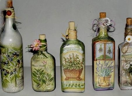 Très souvent, vous pouvez voir des bouteilles décorées dans un décor quotidien, en particulier dans les maisons de campagne . A ces fins, les techniques de décoration de la bouteille avec de la ficelle, de la peinture et du découpage sont souvent utilisées. Le plus souvent, un tel article est encore utilisé comme un vase ou pour stocker divers petits objets.