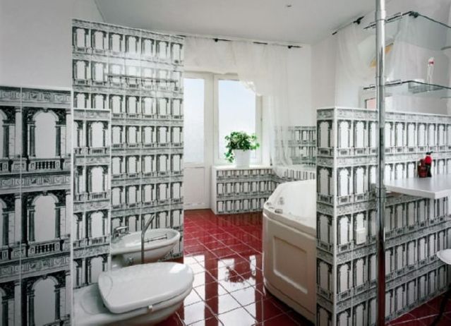Pour les salles de bains, une zone assez grande, vous pouvez également utiliser une variété de cloisons de verre. Mais non moins efficace et efficace, vous pouvez zoner l'espace dans une grande salle de bains, en érigeant une cloison de blocs de verre. Et si certains blocs de verre sont faits de verre coloré, alors une telle cloison deviendra un objet d'art unique dans votre maison et rendra l'intérieur de la salle de bains original et irremplaçable.
