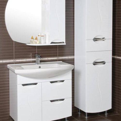 - Le meuble de salle de bains avec un miroir résout deux problèmes à la fois: d'une part il devient le miroir principal ou supplémentaire, d'autre part il aide à agrandir légèrement les dimensions de la pièce visuellement. Mais il est souhaitable de mettre ces meubles loin de la salle de bain afin que les éclaboussures d'eau ne tombent pas sur le miroir.