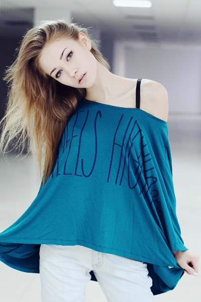 T-shirts de sport avec des slogans ou des impressions volumineuses dans la zone de la poitrine conviendra aux filles avec les épaules étroites et les petits seins. Les poches supérieures ou les garnitures en forme de ruches aideront à augmenter visuellement la poitrine.